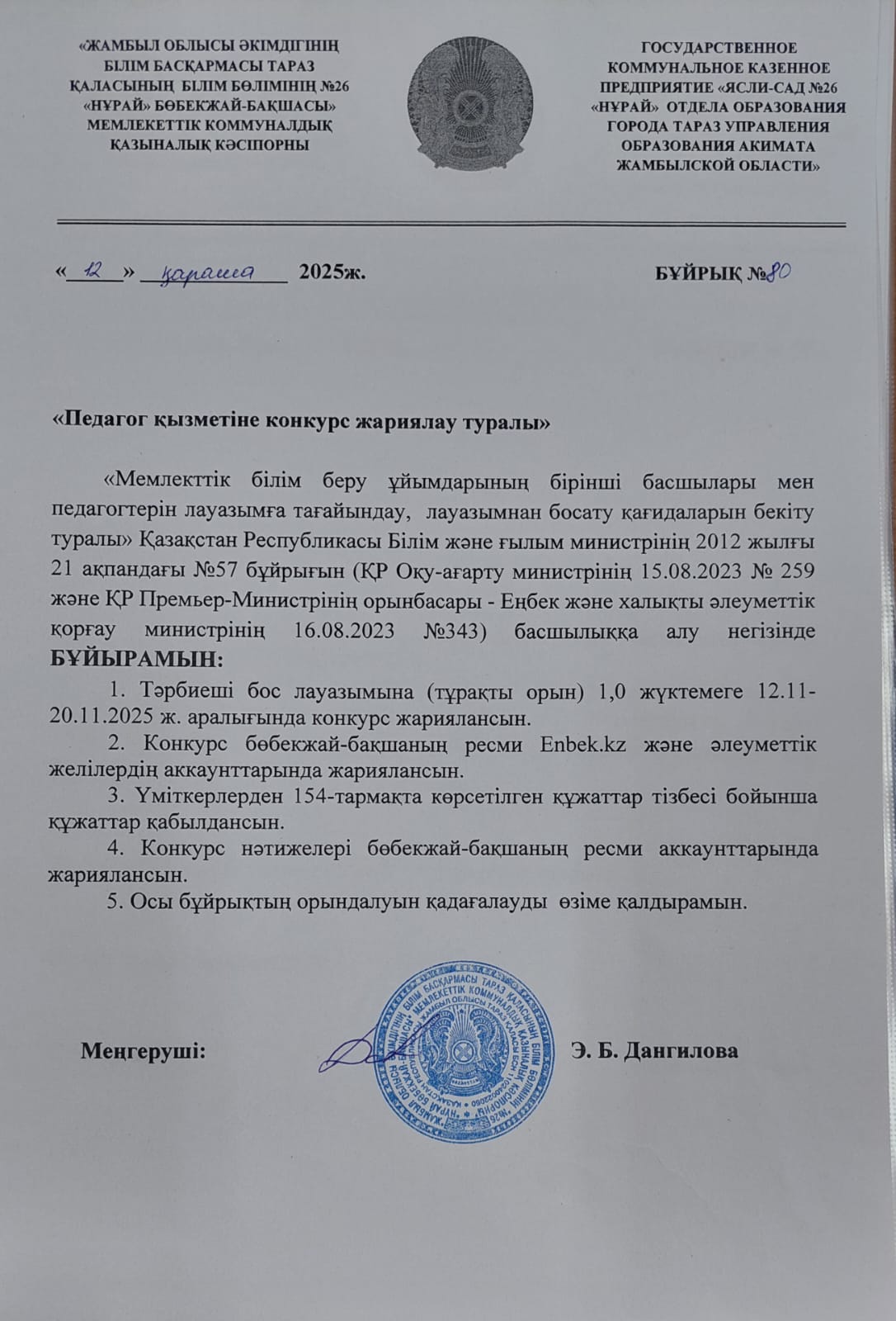 Педагог қызметіне конкурс жариялау туралы бұйрық » "№26 «Нұрай» бөбекжай-бақшасы"