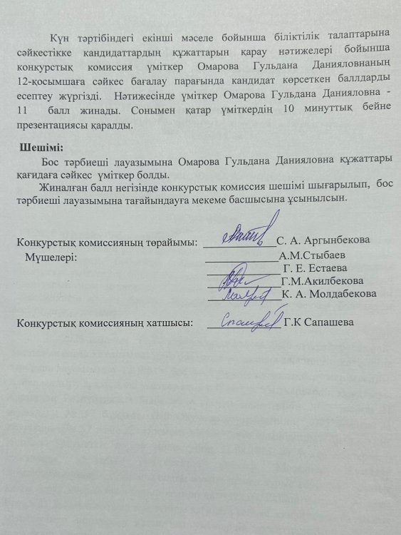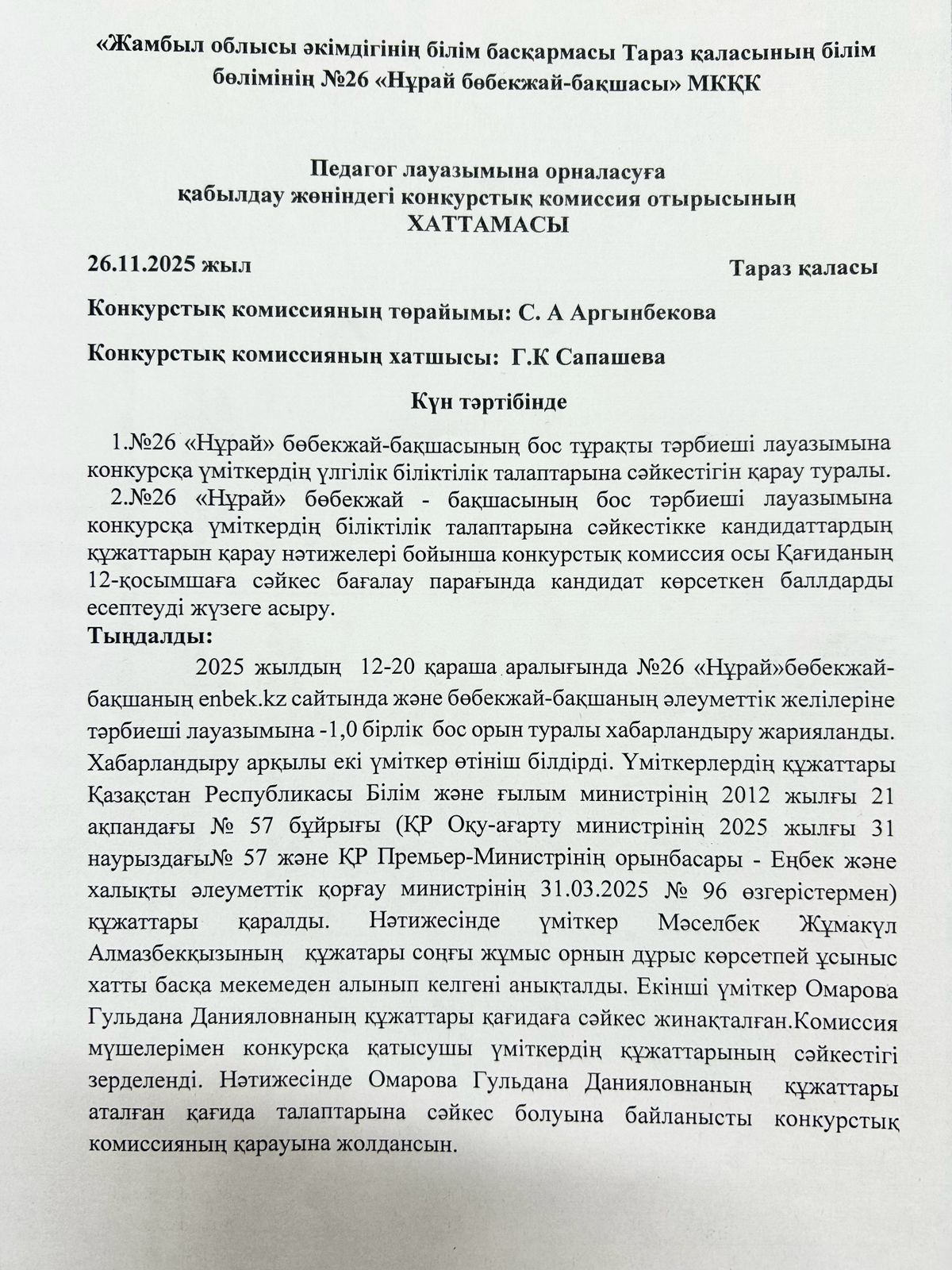 Конкурстық комиссия отырысының хаттамасы » "№26 «Нұрай» бөбекжай-бақшасы"